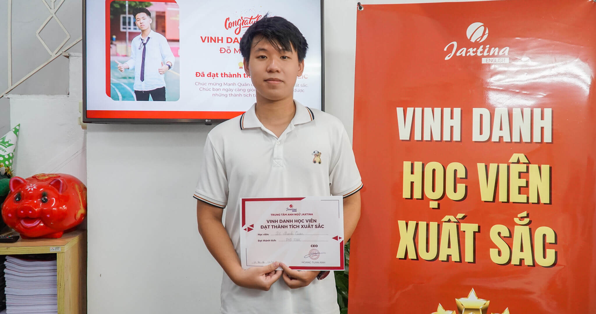 Sau quá trình đồng hành cùng Jaxtina và đạt được điểm số ngoài mong đợi, Quân cũng muốn gửi lời cảm ơn tới trung tâm: “Mình xin cảm ơn thầy cô, đội ngũ nhân viên và trung tâm đã giúp mình đạt được kết quả cao trong suốt thời gian mình học TOEIC vừa qua. Xin chúc thầy cô, đội ngũ nhân viên và trung tâm Jaxtina sẽ ngày càng thành công và lớn mạnh hơn nữa”.