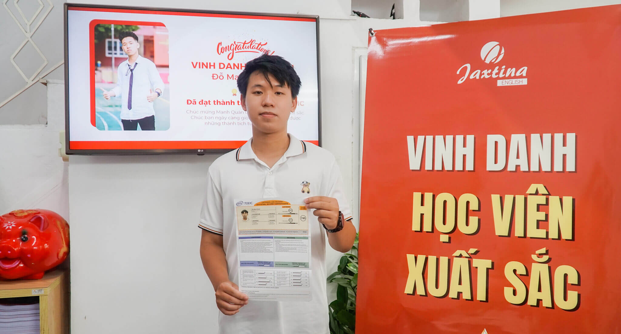 Từ một người luôn mang trong mình nỗi sợ tiếng Anh, sau khi được trang bị đầy đủ kiến thức tại Jaxtina, Quân đã bứt phá bản thân và ở trong tâm thế luôn sẵn sàng bước vào kỳ thi TOEIC. Bạn chia sẻ rằng: “Mình luôn sẵn sàng đi thi TOEIC ngay lập tức. Jaxtina đã giúp mình có thể vượt qua được tất cả những gì mà mình sợ về môn tiếng Anh cũng như sợ về kỳ thi TOEIC”.