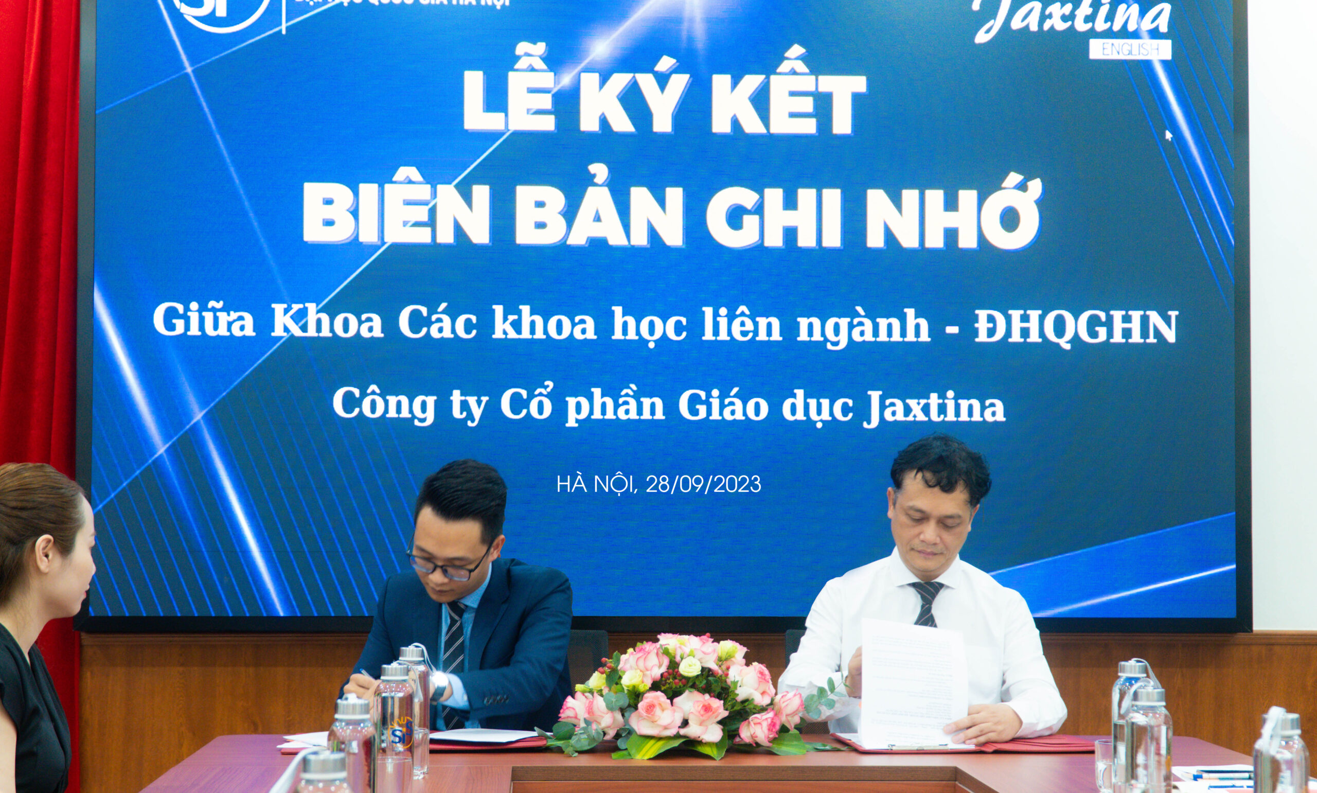 Sáng ngày 28/9/2023, tại văn phòng tầng 4, tòa G7 tại Đại học Quốc gia Hà Nội đã diễn ra Lễ ký kết hợp tác chiến lược giữa Khoa Các khoa học liên ngành thuộc Trường Đại học Quốc gia Hà Nội và Hệ thống Anh ngữ Jaxtina.