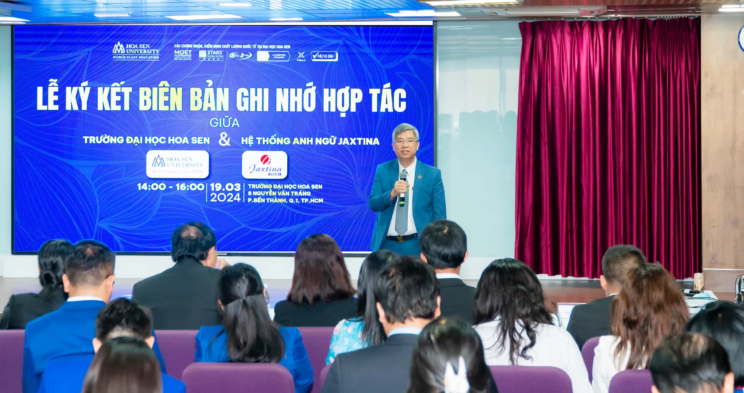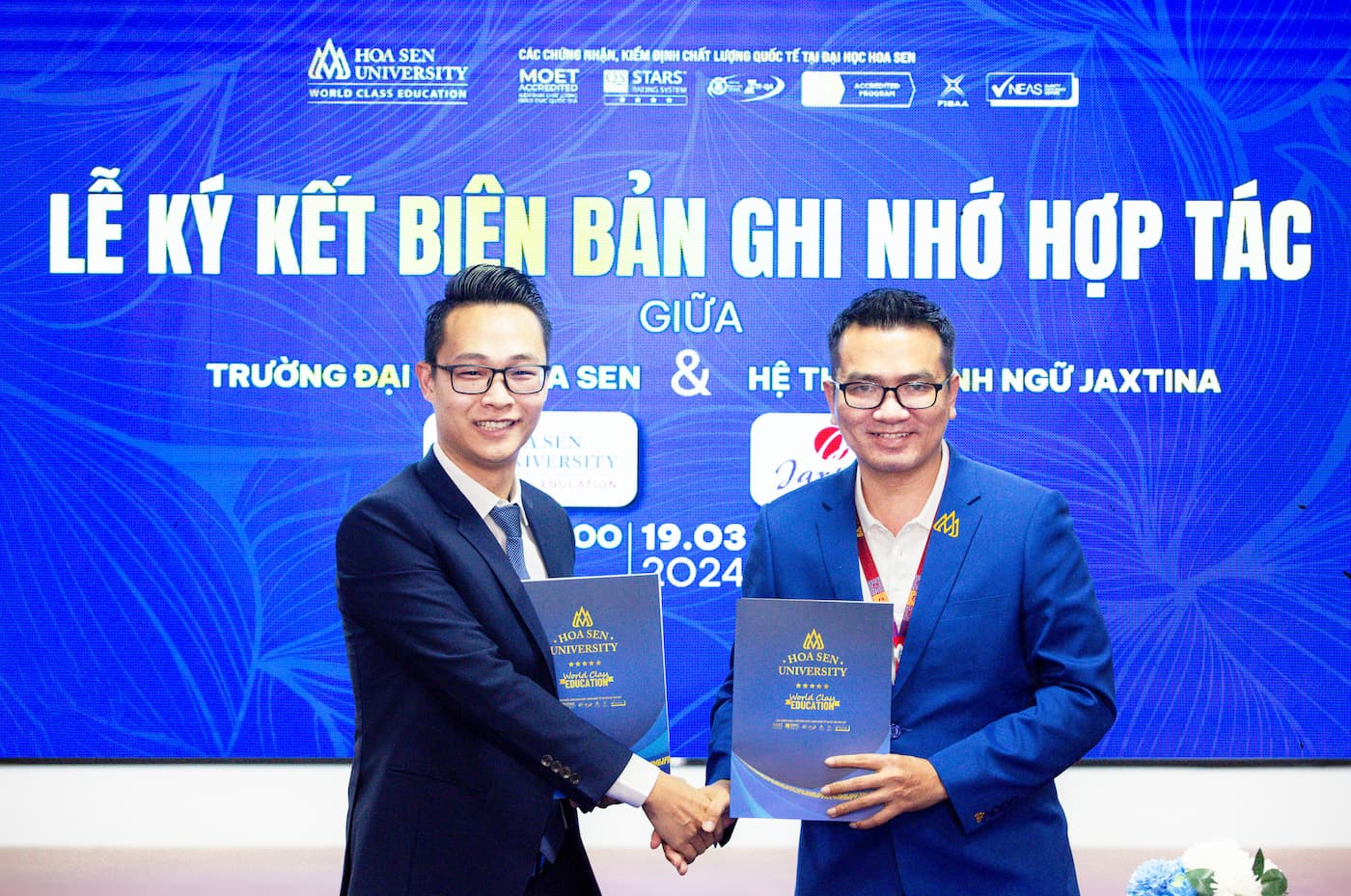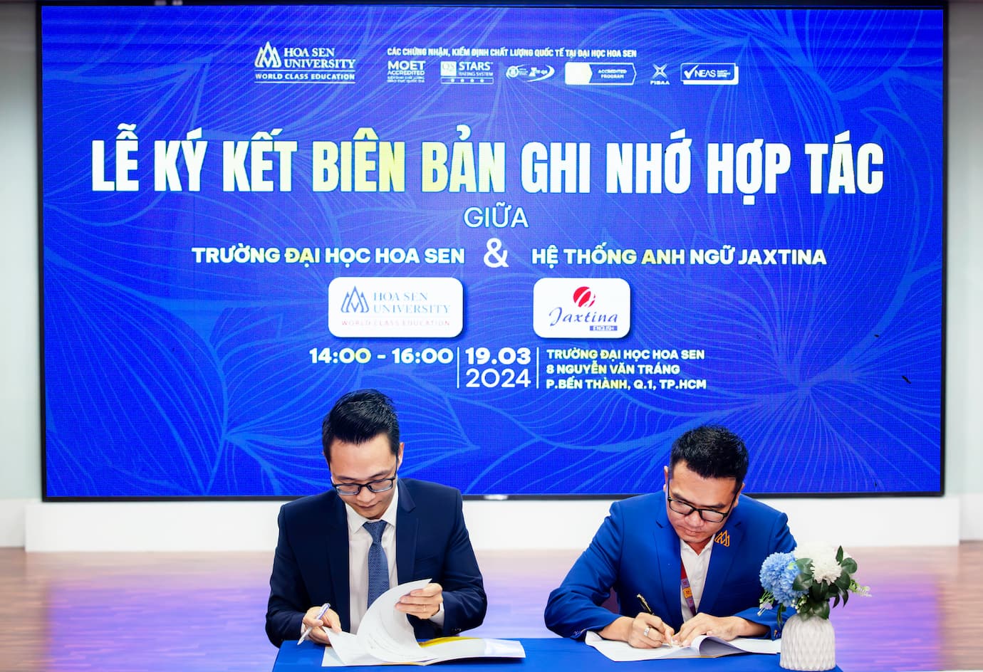 Ngày 19/03/2024, lễ ký kết hợp tác giữa Hệ thống Anh ngữ Jaxtina và Trường Đại học Hoa Sen được tổ chức long trọng tại hội trường Lotus Hall tại cơ sở Nguyễn Văn Tráng, Quận 1 với sự tham dự của các đại biểu, khách mời hai bên cùng gần 100 bạn sinh viên trường.